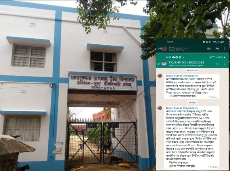 উচ্চ মাধ্যমিক পরীক্ষায় উত্তীর্ণ হওয়া পড়ুয়াদের কথায় ,তাঁদের স্কুল কর্তৃপক্ষ অনেকদিন আগেই ২০২২-২৩ এর দ্বদশ শ্রেনীর ছাত্র ছাত্রীদের নিয়ে একটি হোয়াটসঅ্যাপ গ্রুপ ( TKJBHS (X11) 2022-2023 ) চালু করেন। সেই গ্রুপের অ্যাডমিন রয়েছেন প্রধান শিক্ষক তপন কুমার চক্রবর্তী।এছাড়াও বিদ্যালয়ের ১২৫ তম বর্ষপূর্তি উপলক্ষে আরও একটি হোয়াটসঅ্যাপ গ্রুপ ( TKJBHS ১২৫ বর্ষপূর্তি ) রয়েছে । ৫০০ টাকা স্কুলে জমা না দিলে উচ্চ মাধ্যমিক উত্তীর্ণদের স্কুল লিভিং সার্টিফিকেট’ দেওয়া হবে না ,এই নির্দেশের কথা দ্বাদশ শ্রেণীর ছাত্র ছাত্রীদের নিয়ে তৈরি হোয়াটসঅ্যাপ গ্রুপে প্রধান শিক্ষক উল্লেখ করেছেন বলে উচ্চমাধ্যমিক উত্তীর্ণরা জানিয়েছে ।