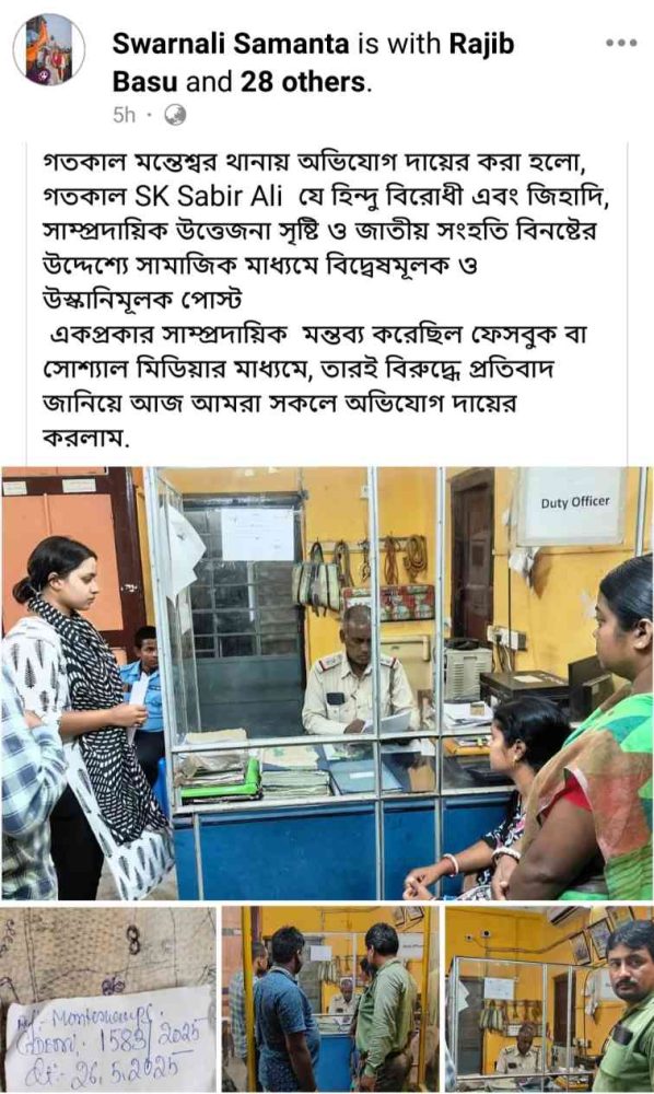 শ্যামসুন্দর ঘোষ,মন্তেশ্বর(পূর্ব বর্ধমান),২৭ মে : দেশ ও হিন্দু বিরোধী পোস্ট করা স্বঘোষিত সাংবাদিক শেখ সাবীর আলীর বিরুদ্ধে পূর্ব বর্ধমান জেলার মন্তেশ্বর থানাতেও দায়ের হল অভিযোগ । মন্তেশ্বর কলেজের অখিল ভারতীয় বিদ্যার্থী পরিষদের(এবিভিপি) নেত্রী স্বর্ণালী সামন্ত নিজের ফেসবুক পেজে এই খবর জানিয়ে লিখেছেন, ‘গতকাল মন্তেশ্বর থানায় অভিযোগ দায়ের করা হলো, গতকাল SK Sabir Ali যে হিন্দু বিরোধী এবং জিহাদি, সাম্প্রদায়িক উত্তেজনা সৃষ্টি ও জাতীয় সংহতি বিনষ্টের উদ্দেশ্যে সামাজিক মাধ্যমে বিদ্বেষমূলক ও উস্কানিমূলক পোস্ট একপ্রকার সাম্প্রদায়িক মন্তব্য করেছিল ফেসবুক বা সোশ্যাল মিডিয়ার মাধ্যমে, তারই বিরুদ্ধে প্রতিবাদ জানিয়ে আজ আমরা সকলে অভিযোগ দায়ের করলাম । তিনি জেনার ডাইরি (জিডি) নম্বরও শেয়ার করেছেন । সেই অনুযায়ী মঙ্গলবার ২৬ মে, মন্তেশ্বর থানায় দায়ের করা জিডি নম্বরটি হল : ১৫৮৩/২০২৫ । এনিয়ে শুধুমাত্র পূর্ব বর্ধমান জেলাতেই শেখ সাবীর আলীর বিরুদ্ধে মোট ৬ টি মামলা রজু করা হল। এর আগে সোমবার বর্ধমান থানায় ৫ মামলা রজু হয় ।