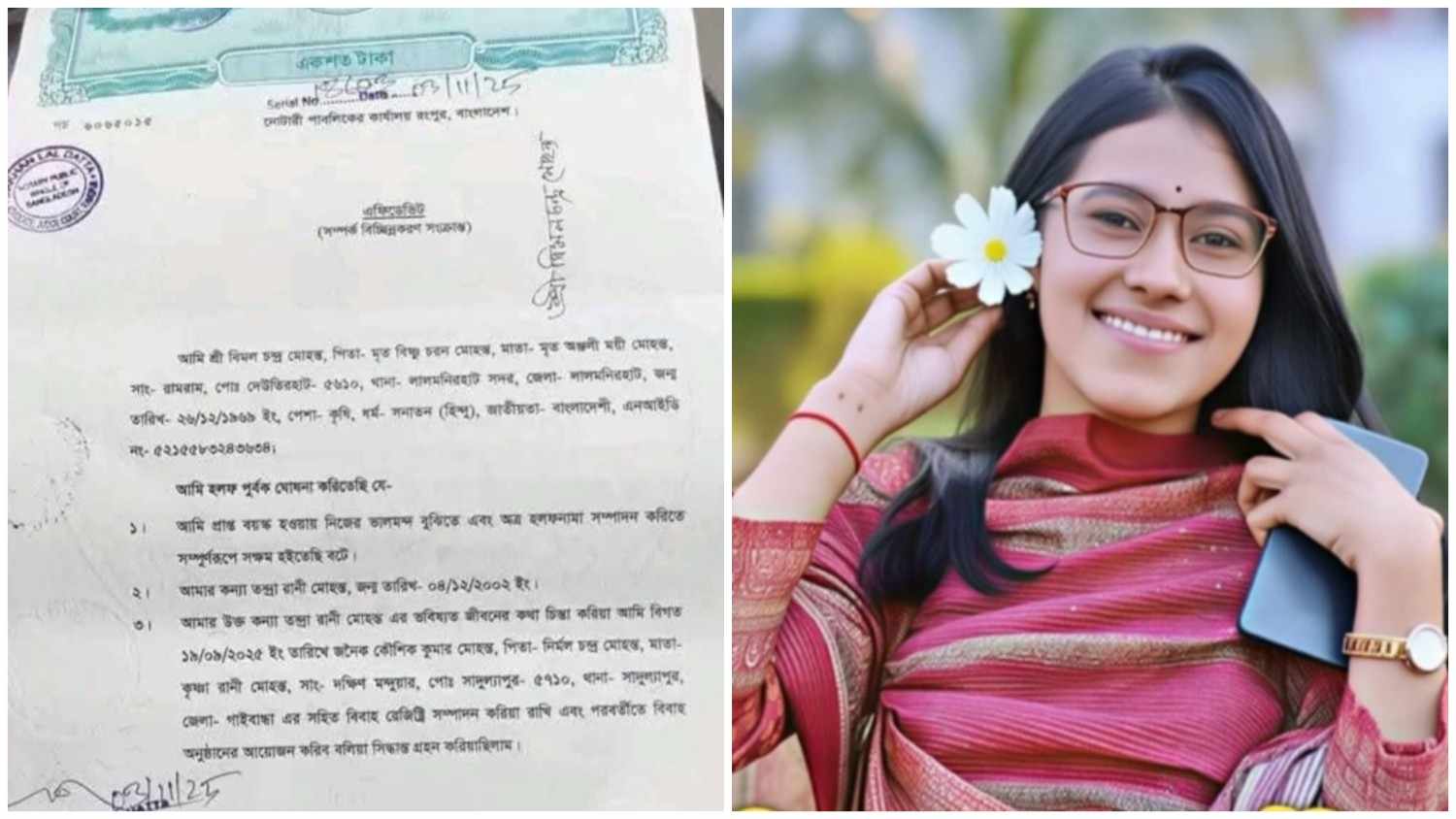 এইদিন ওয়েবডেস্ক,লালমনিরহাট,০৬ নভেম্বর : মুসলিম প্রেমিকের হাত ধরে পালিয়ে ধর্মান্তরিত ও নিকাহ করেছে মেয়ে৷ সেই হারনে পারিবারিক সম্মান রক্ষার্থে আইনত তাকে “ত্যাজ্য কন্যা” করলেন বাবা৷ বাংলাদেশের  লালমনিরহাট সদর উপজেলার রামরাম গ্রামের ঘটনা । হতভাগ্য বাবা বিমল চন্দ্র মোহন্ত রংপুর নোটারী পাবলিকের কার্যালয়ে গত ৩ নভেম্বর এফিডেভিট করে তার মেয়ে তন্দ্রা রানী মোহন্তকে  “ত্যাজ্য কন্যা” করেছেন ।