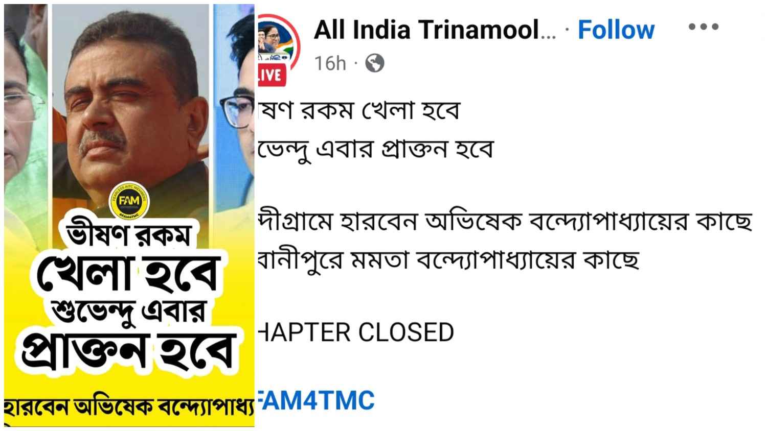 এদিকে তৃণমূল আনুষ্ঠানিকভাবে এখনো প্রার্থী ঘোষণা না করলেও দলের সোশ্যাল মিডিয়া হ্যান্ডেলে বলা হয়েছে যে “নন্দীগ্রামে অভিষেক বন্দ্যোপাধ্যায়ের কাছে ভবানীপুরে মমতা বন্দ্যোপাধ্যায়ের কাছে শুভেন্দু অধিকারী হারবেন” । ওই পোস্টে লেখা হয়েছে : “ভীষণ রকম খেলা হবে । শুভেন্দু এবার প্রাক্তন হবে । নন্দীগ্রামে হারবেন অভিষেক বন্দ্যোপাধ্যায়ের কাছে ভবানীপুরে মমতা বন্দ্যোপাধ্যায়ের কাছে । চ্যাপ্টার ক্লোজড ।”