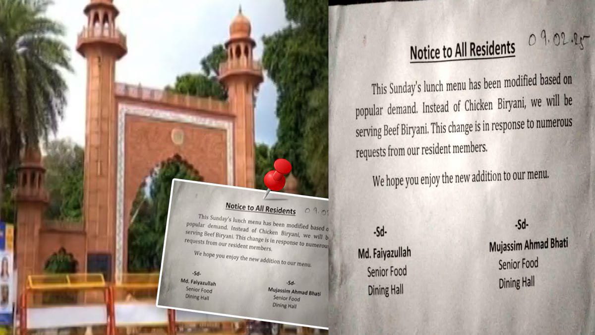 এইদিন ওয়েবডেস্ক,নয়াদিল্লি,০৯ ফেব্রুয়ারী : আলিগড় মুসলিম বিশ্ববিদ্যালয়ের রবিবারের মধ্যাহ্নভোজের মেনু বিতর্কের জন্ম দিয়েছে। আজ রবিবার দুপুরের খাবারের সময় স্যার শাহ সুলাইমান হলে গরুর মাংসের বিরিয়ানি পরিবেশনের নির্দেশ দেওয়া একটি নোটিশ এখন সোশ্যাল মিডিয়ায় ভাইরাল হয়েছে। দুই অনুমোদিত ব্যক্তি মহম্মদ ফায়াজুল্লাহ (Md. Faiyazullah) ও মুজাসসিম আহমেদ ভাটি (Mujassim Ahmad Bhati) স্বাক্ষরিত আজ রবিবারের (৯ ফেব্রুয়ারী) ওই নোটিশে ‘সকল আবাসিকদের উদ্দেশ্যে’ বলা হয়েছে,’জনপ্রিয় চাহিদার উপর ভিত্তি করে এই রবিবারের দুপুরের খাবারের মেনু পরিবর্তন করা হয়েছে। চিকেন বিরিয়ানির পরিবর্তে, আমরা বিফ বিরিয়ানি পরিবেশন করব। এই পরিবর্তনটি আমাদের আবাসিক সদস্যদের কাছ থেকে অনেক অনুরোধের প্রতিক্রিয়ায়। আমরা আশা করি আপনি আমাদের মেনুতে নতুন সংযোজন উপভোগ করবেন।’