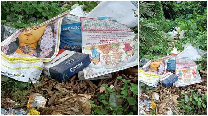জানা গেছে,আজ সোমবার দুপুরে পথচলতি মানুষের নজরে পড়ে যে ওই আস্তাকুঁড়ে ফেলা হয়েছে বিভিন্ন দেবদেবীর ছবি ছাপা কয়েকটি পুরনো ক্যালেন্ডার ও কিছু বর্জ্য সামগ্রী । ওই ছবিগুলির মধ্যে রয়েছে গৌড় -নিতাই ও দেবী দুর্গার একটি বড়সড় ছবি । স্থানীয় বাসিন্দাদের অভিযোগ, বলরাম তলায় বসবাসকারী একটি পরিবার আজ সকালে বেশ কিছু পরিত্যক্ত সামগ্রীর সাথে দেবদেবীর ওই ক্যালেন্ডারগুলিও ফেলে দিয়ে গেছে । শারদোৎসবের আবহে এই প্রকার ন্যাক্কারজনক কাজের তীব্র সমালোচনা করেছেন তারা।