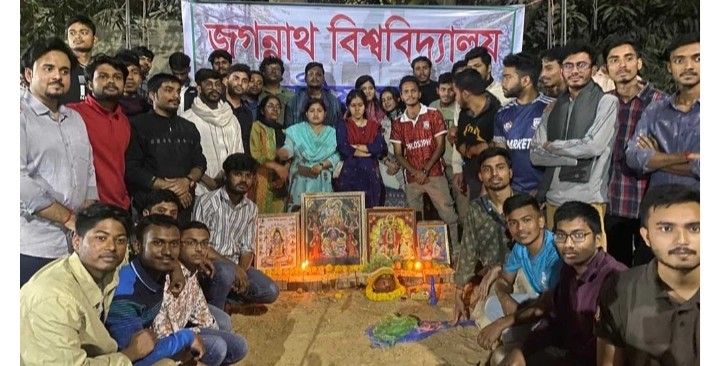 এইদিন ওয়েবডেস্ক,ঢাকা,০৪ ফেব্রুয়ারী : বাংলাদেশের রাজধানী ঢাকার জগন্নাথ বিশ্ববিদ্যালয়ে (জবি) কেন্দ্রীয় মন্দির স্থাপনের জন্য প্রস্তাবিত জায়গায় ‘শৌচাগার’ নির্মাণের প্রতিবাদে এবং দ্রুত মন্দির নির্মাণের দাবিতে দিনভর অবস্থান কর্মসূচি পালন শেষে প্রশাসনের কোনো সাড়া না পেয়ে রাতে নিজেরাই ভিত্তিপূজার মাধ্যমে কেন্দ্রীয় মন্দির উদ্বোধন করেছে সনাতন ধর্মাবলম্বী শিক্ষার্থীরা। মঙ্গলবার দুপুর ১২টায় বিশ্ববিদ্যালয়ের মুক্তমঞ্চে তাদের অবস্থান কর্মসূচি শুরু হয়ে রাত ১০টা পর্যন্ত চলে। এরপর শিক্ষার্থীরা নিজ উদ্যোগে দেবদেবীর ছবির সঙ্গে পূজাসামগ্রী নিয়ে এসে কেন্দ্রীয় মন্দির উদ্বোধনের ঘোষণা করেন এবং সেখানে রাত্রিযাপনের সিদ্ধান্ত নেন।