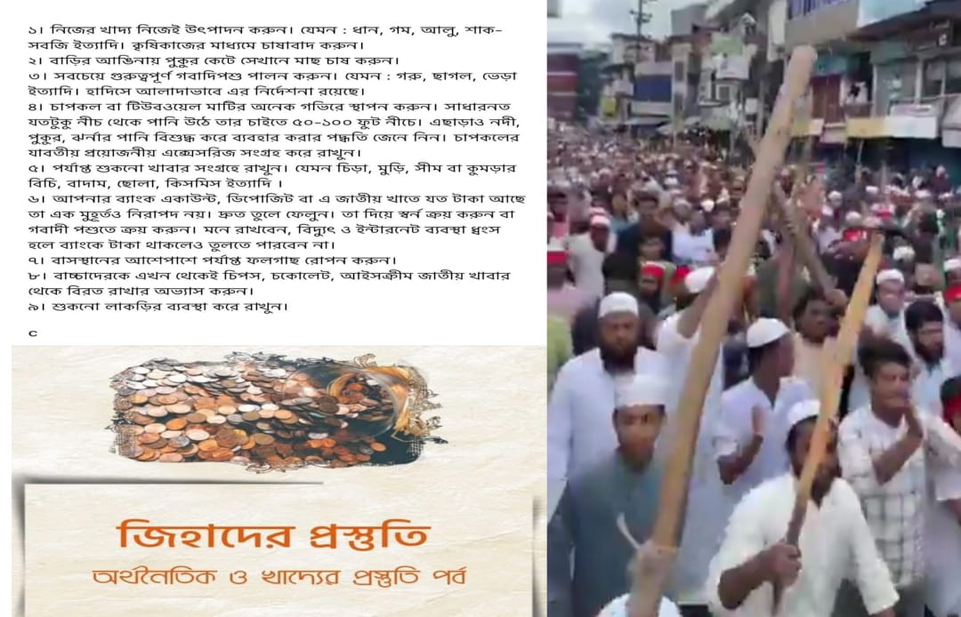 এদিকে ভারতে জিহাদের আগে কিভাবে মুসলিম পরিবারগুলিকে প্রস্তুত হতে হবে তার বিবরণ দিয়ে একটা তালিকা প্রকাশ করেছে বাংলাদেশের সন্ত্রাসী গোষ্ঠীগুলি । “জিহাদের প্রস্তুতি” শীর্ষক ওই তালিকায় “অর্থনৈতিক ও খাদ্যের প্রস্তুতি পর্ব’-এর বিবরণ দেওয়া হয়েছে । ৯ টি পয়েন্ট ভিত্তিক ওই তালিকায় বলা হয়েছে :