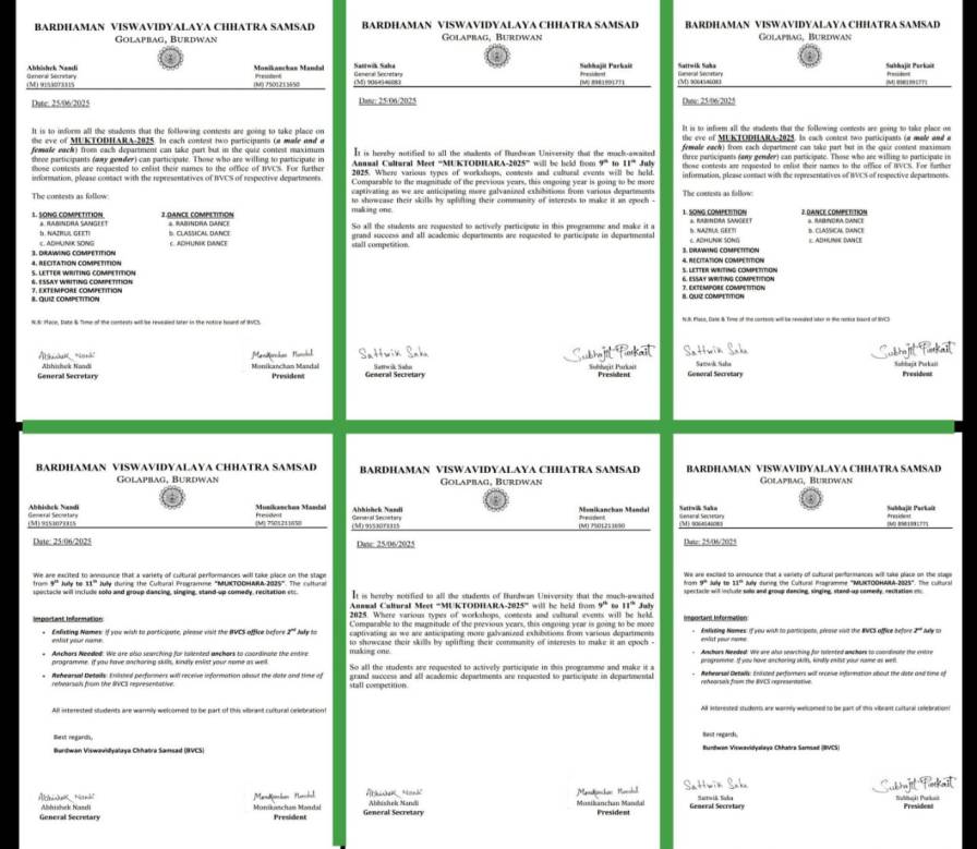 এই ভুতুড়ে কমিটি দুটি শুধু আছে তাই নয়, এরা দুখানি বিজ্ঞপ্তি প্রকাশ করেছেন। বিশ্ববিদ্যালয়ের আগামী সাংস্কৃতিক প্রতিযোগিতা ‘ মুক্তধারা ২০২৫’। তারই বিজ্ঞপ্তি । এতে চোখ কপালে উঠেছে ছাত্র ছাত্রীদের। অনেকেই এটাকে শাসকদলের ছাত্র সংগঠনের গোষ্ঠীদ্বন্দ্বের প্রকাশ বল দাবি করেছেন। তথাকথিত ছাত্র সংসদের তালিকার একটি অনুযায়ী সভাপতি শুভজিৎ পুরকাইত। আর সাধারণ সম্পাদক সাত্বিক সাহা। অন্য তালিকা অনুযায়ী আবার সভাপতি মণিকাঞ্চন মণ্ডল এবং সাধারণ সম্পাদক অভিষেক নন্দী। এদের ’প্যাড’ও একই সাদৃশ্যে ভরা । যদিও এ নিয়ে সরব হয়েছে ছাত্র ছাত্রীদের একাংশ।বিশ্ববিদ্যালয়ের আইন বিভাগের ছাত্র সোনু পাশওয়ান বলেন,’আমরা জানি দীর্ঘদিন ছাত্র সংসদের নির্বাচনই হয়নি আমাদের বিশ্ববিদ্যালয়ে। তাহলে,ছাত্র সংসদের’ জি এস’ আবার থাকবে কোথা থেকে? সংসদ অফিস বন্ধই থাকে। এই দুটো প্যাড কীভাবে চলছে জানি না।’