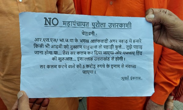 চিঠির একেবারে উপরে লেখ লেখা আছে,’নো মহাপঞ্চায়েত পুরালা উত্তরকাশী’ । তার নিজে লেখা ‘সতর্কবার্তা’ । এরপর লেখা হয়েছে, ‘আরএসএস/বিজেপির গেরুয়া সন্ত্রাসীরা যদি পাহাড়ে আমাদের কারোর কোনো ক্ষতি করে, তাহলে পাহাড়ি কুকুর… তোকেও পাহাড়ে যেতে হবে নয়তো… তোর শিরোচ্ছেদ করা হবে। ‘গাজওয়ায়ে হিন্দ’ ইনশাআল্লাহ উত্তরাখণ্ড থেকে শুরু হবে। শিরশ্ছেদকারীকে ৫ কোটি টাকা পুরস্কার দেওয়া হবে ।’ একেবারে নিচে লেখা ‘মুশতে ইকলাব’ ।