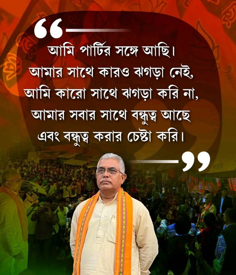 এইদিন ওয়েবডেস্ক,কলকাতা,২৭ মার্চ : আজ সামাজিক যোগাযোগ মাধ্যমে রাজ্য বিজেপির প্রাক্তন সভাপতি তথা প্রাক্তন বিজেপি সাংসদ দিলীপ ঘোষের একটা পোস্ট সকলের নজর কেড়েছে । একটি পোস্টারে নিজের ছবি দিয়ে তিনি লিখেছেন,’আমি পার্টির সঙ্গে আছি। আমার সাথে কারও ঝগড়া নেই, আমি কারো সাথে ঝগড়া করি না, আমার সবার সাথে বন্ধুত্ব আছে এবং বন্ধুত্ব করার চেষ্টা করি।’ কিন্তু হঠাৎ কেন তিনি এই পোস্ট করতে গেলেন ? এ নিয়ে প্রশ্ন উঠতে রাজ্যের রাজনৈতিক মহলে ।
