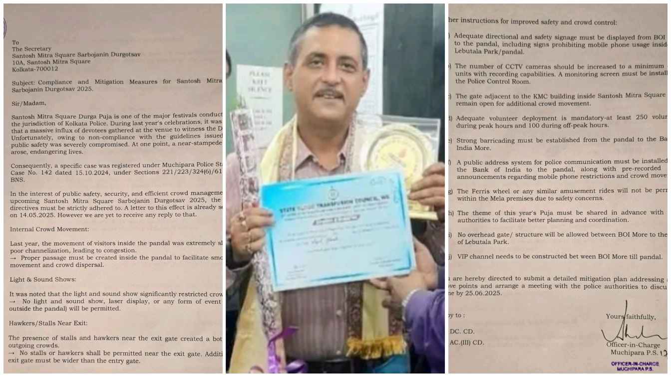 চিঠিতে লেখা হয়েছে,’সন্তোষ মিত্র স্কোয়ার দুর্গাপূজা কলকাতা পুলিশের আওতাধীন অন্যতম প্রধান উৎসব। গত বছরের উদযাপনের সময়, দুর্গোৎসব দেখার জন্য প্রচুর ভক্তের সমাগম লক্ষ্য করা গেছে। দুর্ভাগ্যবশত, আপনাকে জারি করা নির্দেশিকাগুলি না মানার কারণে, জননিরাপত্তা মারাত্মকভাবে বিঘ্নিত হয়েছিল। এক পর্যায়ে, প্রায় বিপজ্জনক পরিস্থিতির সৃষ্টি হয়েছিল, যা জীবনকে বিপন্ন করেছিল। ফলস্বরূপ, মুচিপাড়া থানায় মামলা নম্বর ১৪২ এর অধীনে ১৫.১০.২০২৪ তারিখে, বিএনএস-এর ২২১/২২৩/৩২৪(৬)/৬১(২) ধারার অধীনে একটি নির্দিষ্ট মামলা দায়ের করা হয়েছিল ।