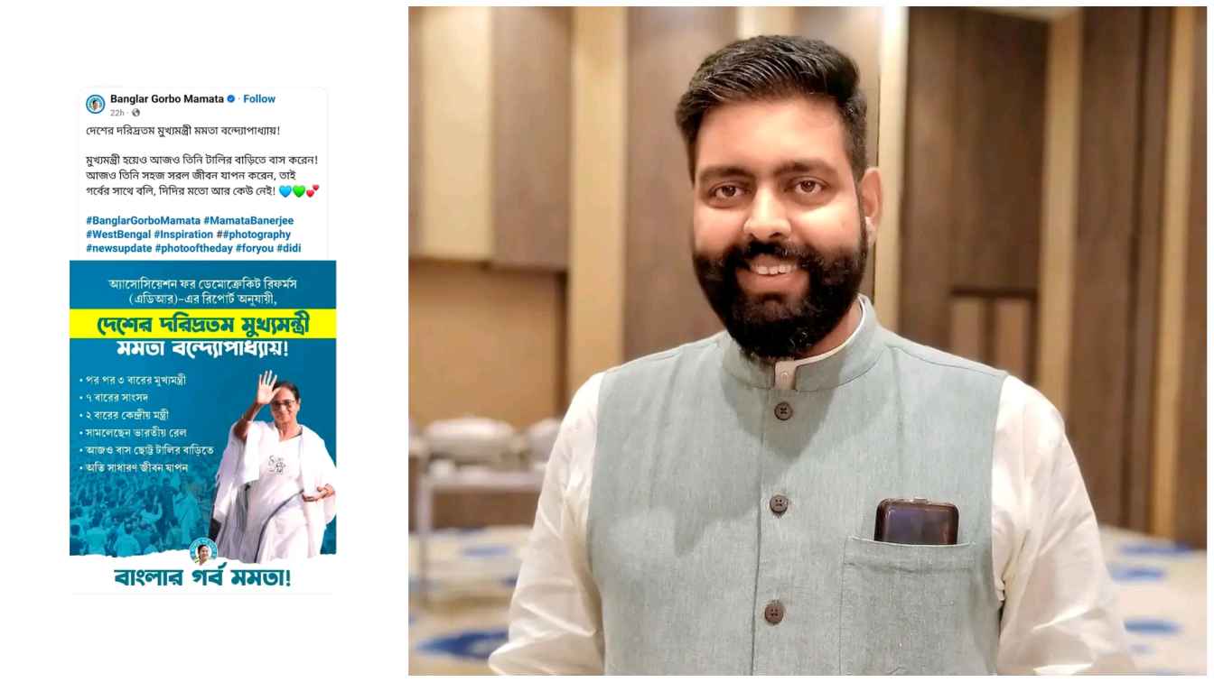 তৃণমূল কংগ্রেসের ওই পেজে দাবি করা হয়েছে,’দেশের দরিদ্রতম মুখ্যমন্ত্রী মমতা বন্দ্যোপাধ্যায়! মুখ্যমন্ত্রী হয়েও আজও তিনি টালির বাড়িতে বাস করেন! আজও তিনি সহজ সরল জীবন যাপন করেন, তাই গর্বের সাথে বলি, দিদির মতো আর কেউ নেই!’ পাশাপাশি একটা পোস্টারে ফলাও করে ছাপা হয়েছে,  ‘দেশের দরিদ্রতম মুখ্যমন্ত্রী মমতা বন্দ্যোপাধ্যায়! পর পর ৩ বারের মুখ্যমন্ত্রী । ৭ বারের সাংসদ । ২ বারের কেন্দ্রীয় মন্ত্রী৷  সামলেছেন ভারতীয় রেল । আজও বাস ছোট্ট টালির বাড়িতে । অতি সাধারণ জীবন যাপন ।’