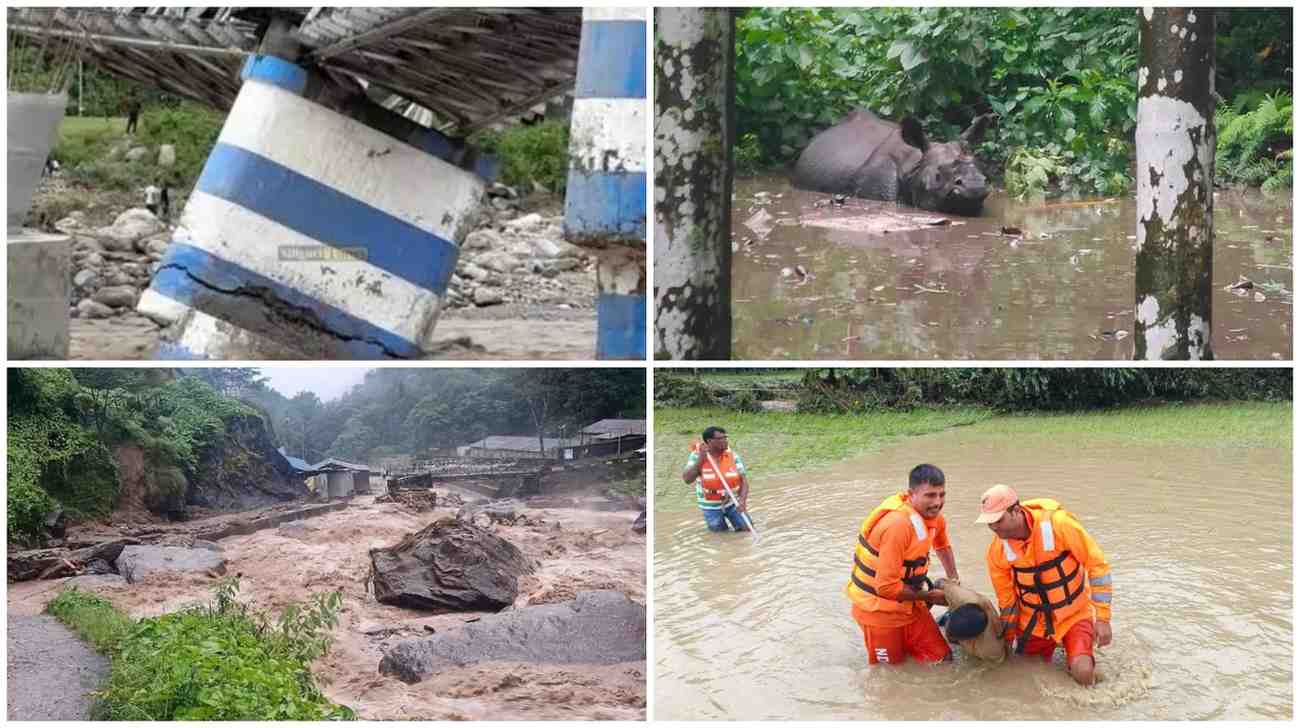 এদিকে উত্তরবঙ্গের যে খবর পাওয়া যাচ্ছে তা খুবই ভয়াবহ । মিরিক, দুধিয়া, সুখিয়াপোখরি, নাগরাকাটা, বানারহাট, রামসাই প্রভৃতি এলাকায় ব্যাপক প্রভাব পড়ে । এছাড়া জলমগ্ন হয়ে গেছে কোচবিহারের দিনহাটা, আলিপুরদুয়ারের বিস্তীর্ণ এলাকা ।বালাসন, তিস্তা, তোর্ষা, জলঢাকা, রায়ডাক, সংকোশ সহ পাহাড়ের নদিগুলিতে হঠাৎ করে জলস্তর প্রচুর বেড়ে গেছে । শালকুমারহাটের শিসামারা নদীর বাঁধ ভেঙে জল ঢুকছে নেপালিবস্তি, নতুনপাড়া, জলদাপাড়া বাজারে। হাজার খানেক মানুষ বাসিন্দা জলবন্দি হয়ে গেছে ।অন্যদিকে কামাখ্যাগুড়িতে একাধিক বাড়ি জলমগ্ন হয়ে গেছে । বন্যার জলে ভেসে আসছে বন্যজন্তু । রামসাইয়ে জলঢাকার জলে একটি গন্ডার ভেসে আসতে দেখা গেছে । ফলে ব্যাপক আতঙ্ক ছড়িয়ে পড়েছে । প্রবল বৃষ্টিতে দুধিয়ার বালাসন নদীর উপর আয়রন ব্রীজের একাংশ ভেঙ্গে পড়েছে । বন্ধ হয়ে গেছে দার্জিলিং-মিরিক সড়ক যোগাযোগ ।রবিবার বেলা সাড়ে ১১টা নাগাদ জলের তোড়ে হলং নদীর উপরে থাকা কাঠের সেতুটির প্রায় ৩০ মিটার অংশ ভেঙে পড়ে। এই ঘটনায় আটকে পড়েছেন জলদাপাড়া টুরিস্ট লজে থাকা প্রায় শতাধিক পর্যটক। কারণ এই হলং নদীর উপরে থাকা কাঠের সেতুটিই হল জলদাপাড়া টুরিস্ট লজে যাওয়ার একমাত্র পথ । তাই সেতু ভেঙে পড়ায় তাদের ফেরার রাস্তাও বন্ধ হয়ে গেছে । তারই মাঝে জলবন্দী মানুষদের উদ্ধারে নেমে পড়েছে সিভিল ডিফেন্স । আগামীকাল উত্তরবঙ্গে মুখ্যমন্ত্রী মমতা বন্দ্যোপাধ্যায় যাবেন বলে জানিয়েছেন ।।