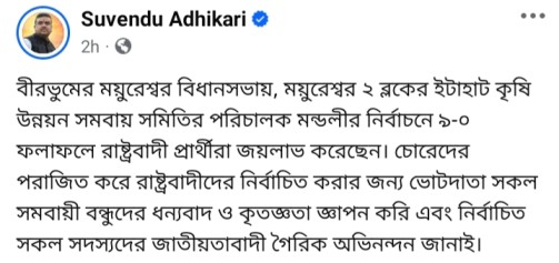 এইদিন ওয়েবডেস্ক,বীরভুম,১৩ জুলাই : বিরোধীদের “চড়াম চড়াম ঢাক বাজানোর” হুঙ্কার দেওয়া তৃণমূল কংগ্রেসের দাপুটে নেতা অনুব্রত মণ্ডলের গড়ে ফুটলো পদ্মফুল । আজ রবিবার বীরভূমের সাঁইথিয়ার ইটাহাট সমবায় সমিতির নির্বাচনে নটি আসনের সবগুলিই জিতে নিয়েছে বিজেপি । বিরোধী দলনেতা শুভেন্দু অধিকারী দলের জয়ে উচ্ছ্বসিত । তিনি “চোরেদের পরাজিত” করায় নির্বাচিত “রাষ্ট্রবাদীদের” কৃতজ্ঞতা জ্ঞাপন করে সোশ্যাল মিডিয়ায় একটা পোস্ট করেছেন । শুভেন্দু লিখেছেন,’বীরভুমের ময়ুরেশ্বর বিধানসভায়, ময়ুরেশ্বর ২ ব্লকের ইটাহাট কৃষি উন্নয়ন সমবায় সমিতির পরিচালক মন্ডলীর নির্বাচনে ৯-০ ফলাফলে রাষ্ট্রবাদী প্রার্থীরা জয়লাভ করেছেন। চোরেদের পরাজিত করে রাষ্ট্রবাদীদের নির্বাচিত করার জন্য ভোটদাতা সকল সমবায়ী বন্ধুদের ধন্যবাদ ও কৃতজ্ঞতা জ্ঞাপন করি এবং নির্বাচিত সকল সদস্যদের জাতীয়তাবাদী গৈরিক অভিনন্দন জানাই।’