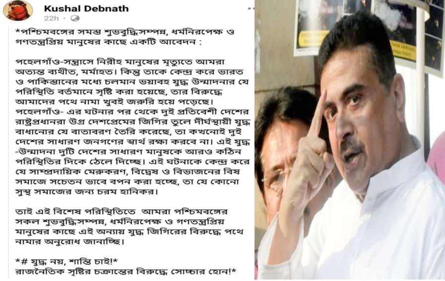 শুভেন্দু অধিকারী লিখেছেন,’ জন বিচ্ছিন্ন সেকু-মাকু, স্বঘোষিত বুদ্ধিজীবী, দেউলিয়া রাষ্ট্র বিরোধী মনোভাবাপন্ন কিছু বাচাল আগামী ১২ তারিখ ‘যুদ্ধ- উন্মাদনা বিরোধী গণমিছিল’ সংগঠিত করেছে বলে শোনা যাচ্ছে। উক্ত সংগঠকদের উচিত বেলুড় মঠের সাধারণ সম্পাদক; স্বামী সুবীরানন্দ মহারাজ জীর এই বার্তাটি শোনা ও ওনার কথার অর্থ উপলব্ধি করা।’