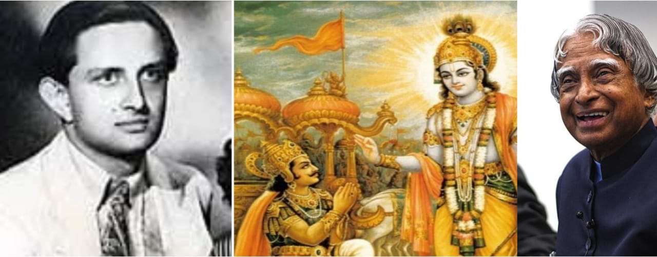 সেই ভদ্রলোক হাসতে শুরু করলেন… তারপর দুটি বড় গাড়ি সেখানে এলো… একটি গাড়ি থেকে কিছু কালো কমান্ডো বেরিয়ে এলো… এবং অন্য গাড়ি থেকে একজন সৈনিক বেরিয়ে এলো। সৈনিক যখন পিছনের গেটটি খুলল, ভদ্রলোক চুপচাপ গাড়িতে গিয়ে বসলেন…ছেলেটি এই সব দেখে হতবাক হয়ে গেল। সে দৌড়ে গিয়ে জিজ্ঞেস করল -‘স্যার… স্যার আপনি কে?’ সেই ভদ্রলোক বললেন– আমি সেই বিক্রম সারাভাই যার বিক্রম সারাভাই রিসার্চ ইনস্টিটিউটে তুমি পড়াশোনা করো… ছেলেটি ৪৪০ ভোল্টের একটি শক পেল। এই ছেলেটা কে ছিল জানেন? ডঃ আব্দুল কালাম । এরপর ডক্টর কালাম ভগবত গীতা পাঠ করেন । এই ভগবদগীতা পড়ার পর, ডঃ আব্দুল কালাম তার বাকি জীবন মাংস না খাওয়ার প্রতিজ্ঞা করেছিলেন…গীতা একটি মহান বিজ্ঞান…।