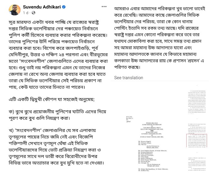 রবিবার শুভেন্দু অধিকারী নিজের ফেসবুক পেজে এনিয়ে লিখেছেন,’সূত্র মারফত একটা খবর পাচ্ছি যে রাজ্যের স্বরাষ্ট্র দপ্তর সিভিক ভলেন্টিয়ার দের পঞ্চায়েত নির্বাচনে পুলিশ কর্মী হিসেবে ব্যবহার করার পরিকল্পনা করেছে। তাদের পুলিশের উর্দি পরিয়ে পঞ্চায়েত নির্বাচনে ব্যবহার করা হবে। বিশেষ করে জলপাইগুড়ি, পূর্ব মেদিনীপুর, উত্তর ও দক্ষিণ ২৪ পরগনা এবং বীরভূমের মতো “সংবেদনশীল” জেলাগুলিতে এদের ব্যবহার করা হবে। শুধু তাই নয় পরিকল্পনা এমন যে তাদের নিজের জেলায় না রেখে অন্য জেলায় ব্যবহার করা হবে যাতে তারা যে সিভিক ভলেন্টিয়ার সেই পরিচয় প্রকাশ না পায়, কেউ যাতে তাদের চিনতে না পারেন।’