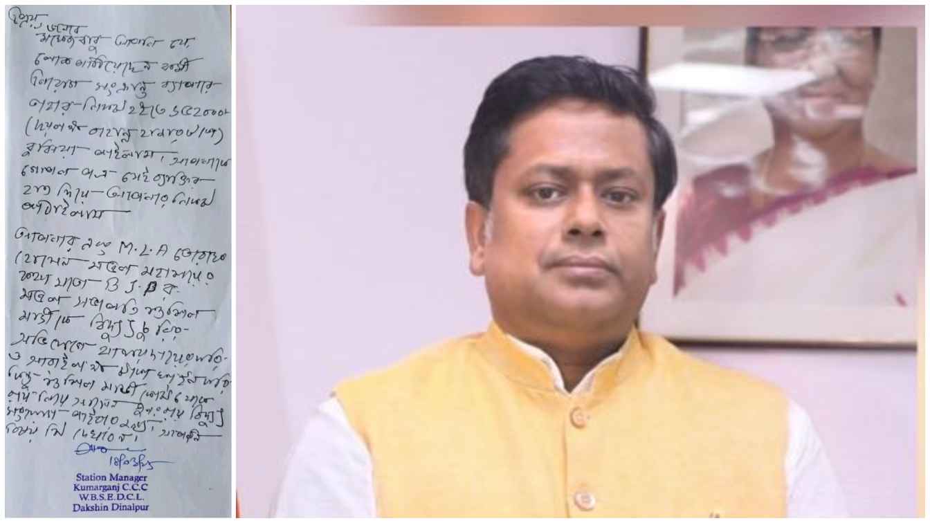 আপনার এবং এমএলএ তোরাফ হোসেন মন্ডল মহাশয়ের কথামতো বিজেপির মন্ডল সভাপতি সুশিল মাঝিকে বিদ্যুৎ চুরির অভিযোগের থানায় দায়ের করি ও *#* টাকা ফাইন করি । কিন্তু সুশিল মাঝি কোর্ট থেকে রায় নিয়ে আসিলেন পুনরায় বিদ্যুৎ সংযোগ পাইবার জন্য । আপনি বিষয়টি দেখবেন ।’ ওই চিরকুটের একেবারের নিচে দক্ষিণ দিনাজপুর জেলার কুমারগঞ্জের রাজ্য বিদ্যুৎ দপ্তরের এসেন ম্যানেজারের স্বাক্ষর ও সিল দেওয়া আছে ।”