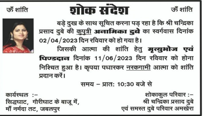 সুজিত স্বামীর শেয়ার করা শ্রাদ্ধানুষ্ঠানের কার্ডে একেবারে উপরে লেখা আছে “শোক সন্দেশ” । চন্দ্রিকা প্রসাদ দুব ও পরিবারবর্গের নামে ছাপানো ওই কার্ডে বলা হয়েছে,’অত্যন্ত দু:খের সঙ্গে জানানো হচ্ছে যে শ্রী চন্দ্রিকা প্রসাদ দুবের কুপুত্রী অনামিকা দূবের গত ০২/০৪/২০২৩ তারিখ রবিবার স্বর্গবাস হয়েছে । তার আত্মার শান্তির জন্য মৃত্যুভোজ ও পিন্ডদান ১১/০৬/২০২৩ রবিবার স্থির করা হয়েছে । দয়া করে উক্ত অনুষ্ঠানে উপস্থিত হয়ে নরকগামী আত্মার শান্তির জন্য প্রার্থনা করবেন ।’ কার্ডের নিচে লেখা হয়েছে, ‘কার্যস্থল, সিদ্ধিঘাট, গৌরিঘাটের পাশে । মা নর্মদার তট,জব্বলপুর ।’
