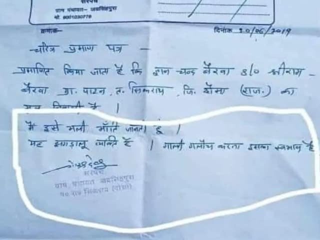 এইদিন ওয়েবডেস্ক,রাজস্থান,০৮ জুলাই : অনেক সময় সরকারি কাজের জন্য চারিত্রিক সনদপত্রের প্রয়োজন হয়। যা এলাকার কাউন্সিলর বা গ্রামের পঞ্চায়েত প্রধানকে( সরপঞ্চ) দিয়ে দেওয়া হয়। এতে সেই ব্যক্তির ভালো ভালো কথা লিখতে হয় এবং তার চরিত্র সম্পর্কে জানাতে হয়। এটি লেখা হয় যাতে ওই ব্যক্তির সরকারি কাজ সম্পন্ন করা যায়। যদি কখনও এতে কোনও ভুল থাকে, তাহলে পরবর্তী প্রক্রিয়ায় সমস্যা হয়। সম্প্রতি, একজন ব্যক্তির চারিত্রিক সনদপত্র সোশ্যাল মিডিয়ায় পোস্ট করা হয়েছে। যেখানে সরপঞ্চ এমন কিছু লিখেছিলেন যে সবাই বলছে যে সরপঞ্চ শত্রুতা প্রকাশ করেছেন।