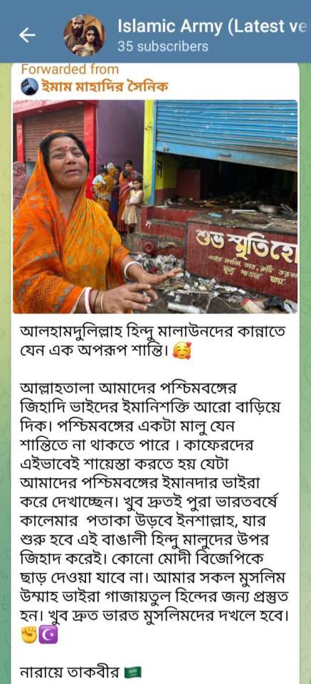 আল্লাহতালা আমাদের পশ্চিমবঙ্গের জিহাদি ভাইদের ইমানিশক্তি আরো বাড়িয়ে দিক। পশ্চিমবঙ্গের একটা মালু যেন শান্তিতে না থাকতে পারে। কাফেরদের এইভাবেই শায়েস্তা করতে হয় যেটা আমাদের পশ্চিমবঙ্গের ইমানদার ভাইরা করে দেখাচ্ছেন। খুব দ্রুতই পুরা ভারতবর্ষে কালেমার পতাকা উড়বে ইনশাল্লাহ, যার শুরু হবে এই বাঙালী হিন্দু মালুদের উপর জিহাদ করেই। কোনো মোদী বিজেপিকে ছাড় দেওয়া যাবে না। আমার সকল মুসলিম উম্মাহ ভাইরা গাজায়তুল হিন্দের জন্য প্রস্তুত হন। খুব দ্রুত ভারত মুসলিমদের দখলে হবে। নারায়ে তাকবীর ।’