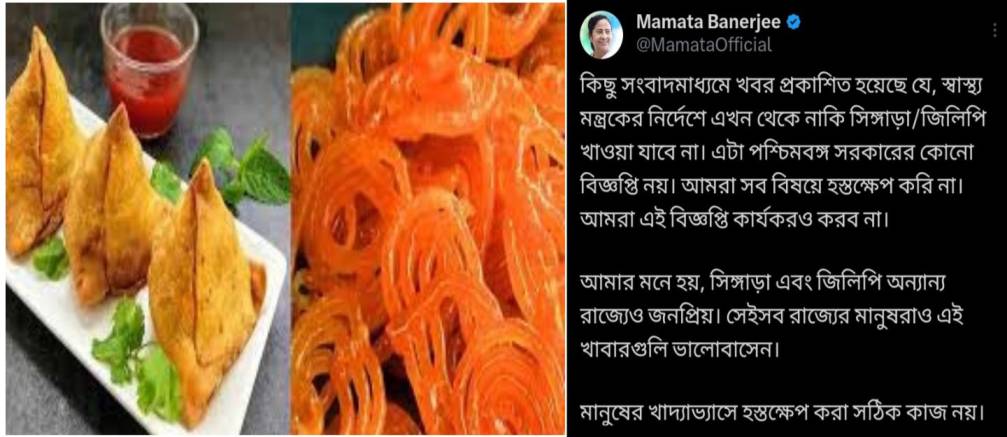 এইদিন ওয়েবডেস্ক,কলকাতা,১৫ জুলাই : কসবার ল’কলেজের ভিতরে ছাত্রীকে গনধর্ষণের ঘটনায় মুখে কুলুপ! এসএসসির নিয়োগ দুর্নীতিতে অযোগ্য প্রার্থীদের নাম প্রকাশ করা নিয়ে অনীহা ! কিন্তু সিঙ্গারা, জিলেবি এবং লাড্ডুর মতো খাদ্যপণ্যের উপর কেন্দ্রীয় স্বাস্থ্য সতর্কতার ‘গুজবে’ তড়িঘড়ি প্রতিক্রিয়া দিয়ে বসলেন এরাজ্যের মুখ্যমন্ত্রী মমতা ব্যানার্জি । আজ সন্ধ্যা ৬:২২ নাগাদ মমতা ব্যানার্জি এক্স-এ এই বিষয়ে লিখেছেন,’কিছু সংবাদমাধ্যমে খবর প্রকাশিত হয়েছে যে, স্বাস্থ্য মন্ত্রকের নির্দেশে এখন থেকে নাকি সিঙ্গাড়া/জিলিপি খাওয়া যাবে না। এটা পশ্চিমবঙ্গ সরকারের কোনো বিজ্ঞপ্তি নয়। আমরা সব বিষয়ে হস্তক্ষেপ করি না। আমরা এই বিজ্ঞপ্তি কার্যকরও করব না।আমার মনে হয়, সিঙ্গাড়া এবং জিলিপি অন্যান্য রাজ্যেও জনপ্রিয়। সেইসব রাজ্যের মানুষরাও এই খাবারগুলি ভালোবাসেন। মানুষের খাদ্যাভ্যাসে হস্তক্ষেপ করা সঠিক কাজ নয়।’
