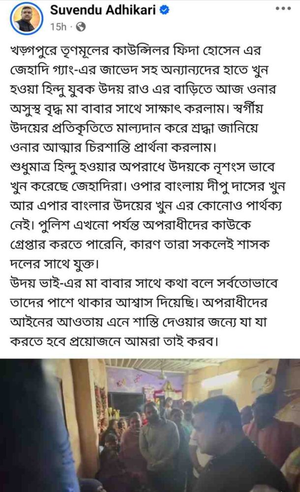 শুভেন্দু অধিকারীর অভিযোগ,’খড়্গপুরে তৃণমূলের কাউন্সিলর ফিদা হোসেন-এর জেহাদি গ্যাং-এর জাভেদ সহ অন্যান্যদের হাতে খুন হওয়া হিন্দু যুবক উদয় রাও এর বাড়িতে আজ ওনার অসুস্থ বৃদ্ধ মা বাবার সাথে সাক্ষাৎ করলাম। স্বর্গীয় উদয়ের প্রতিকৃতিতে মাল্যদান করে শ্রদ্ধা জানিয়ে ওনার আত্মার চিরশান্তি প্রার্থনা করলাম।’