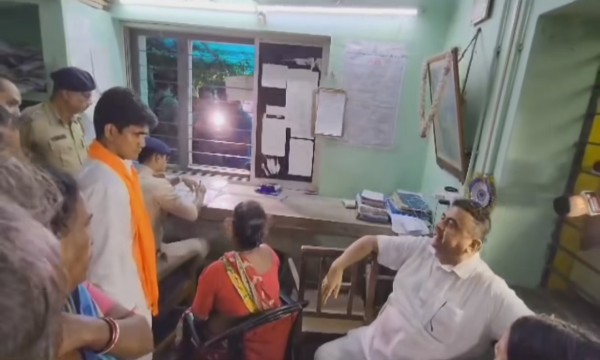থানায় বসে অভিযোগ দায়ের করছেন শুভেন্দু অধিকারী ।